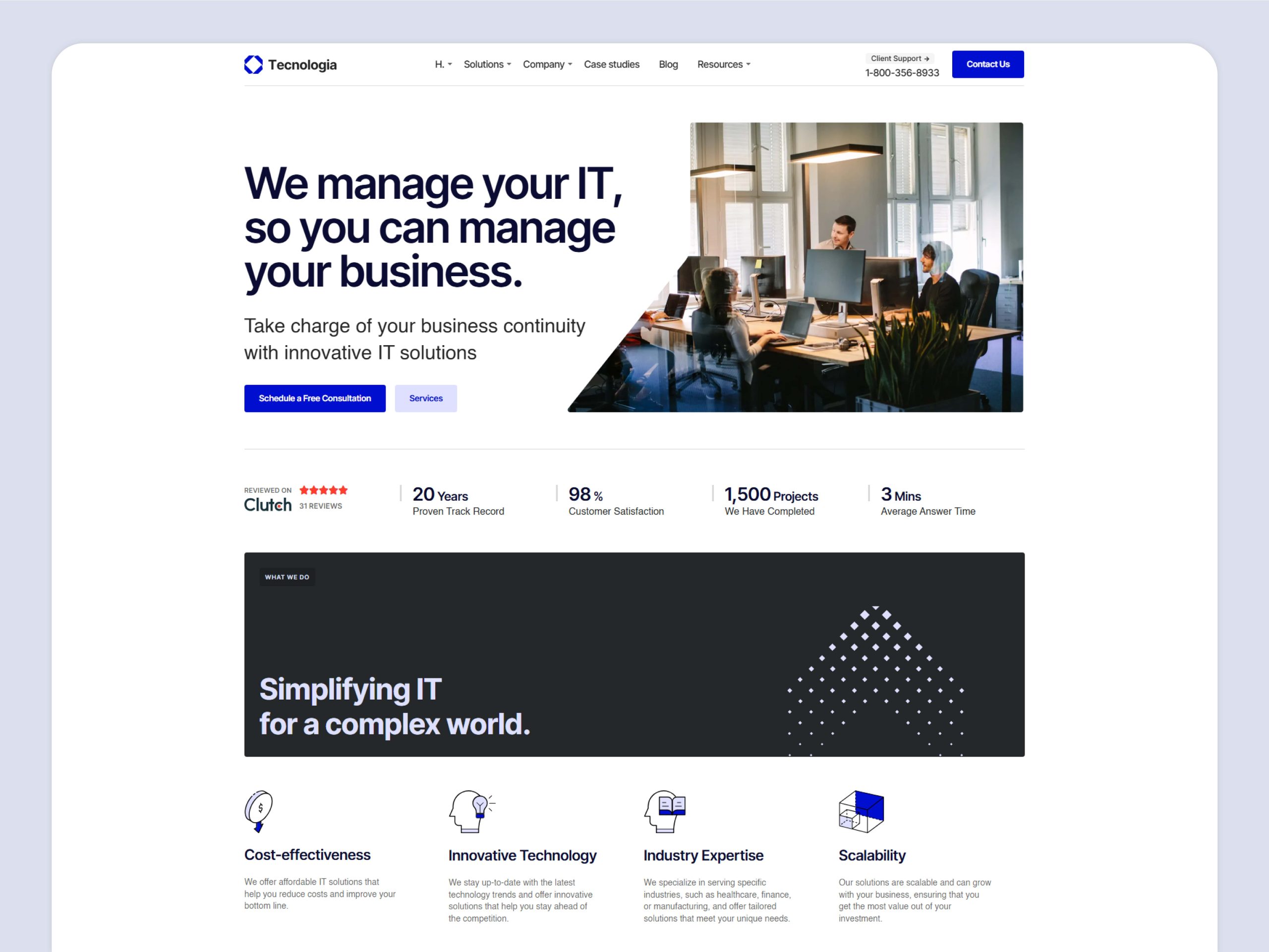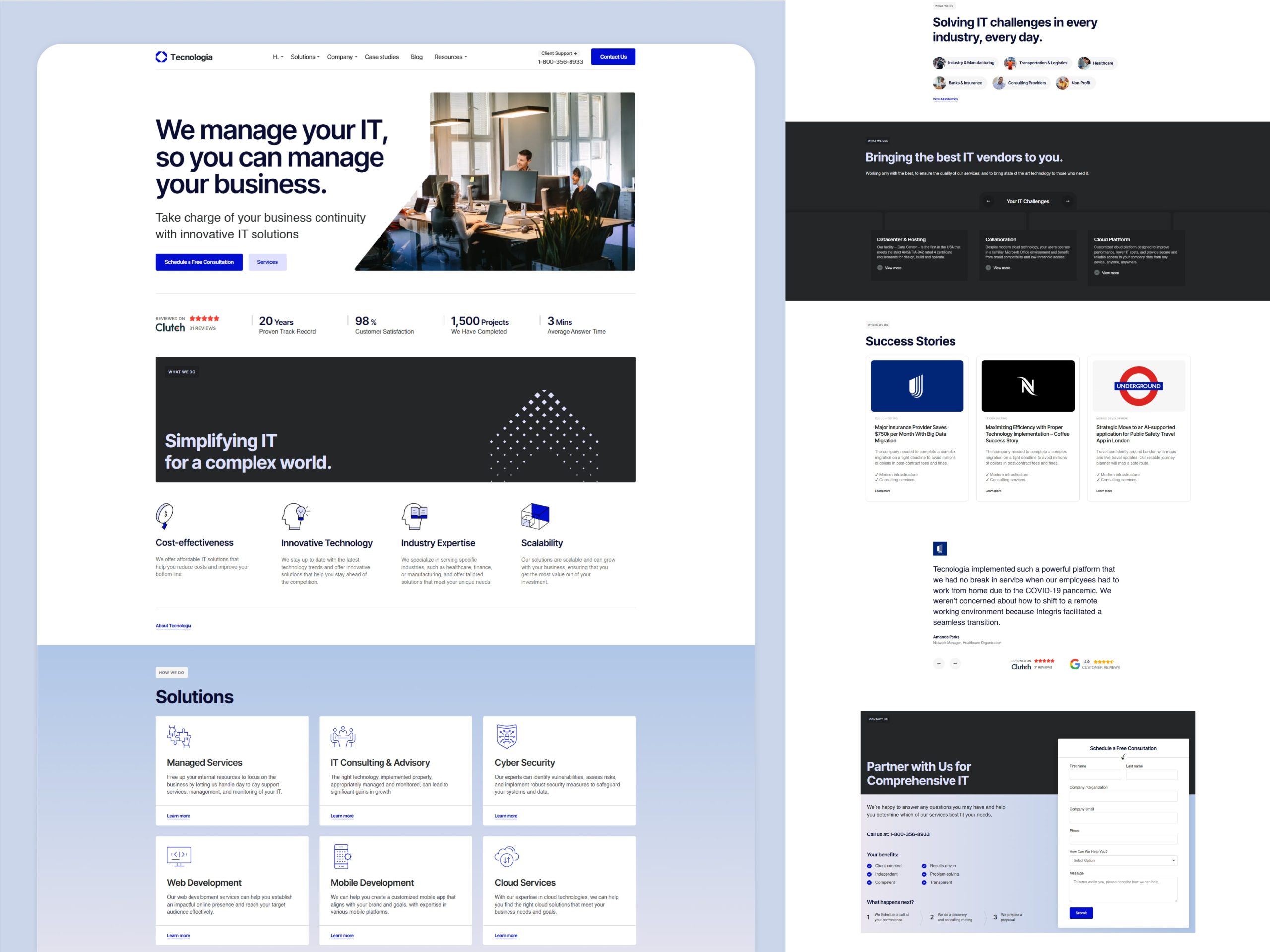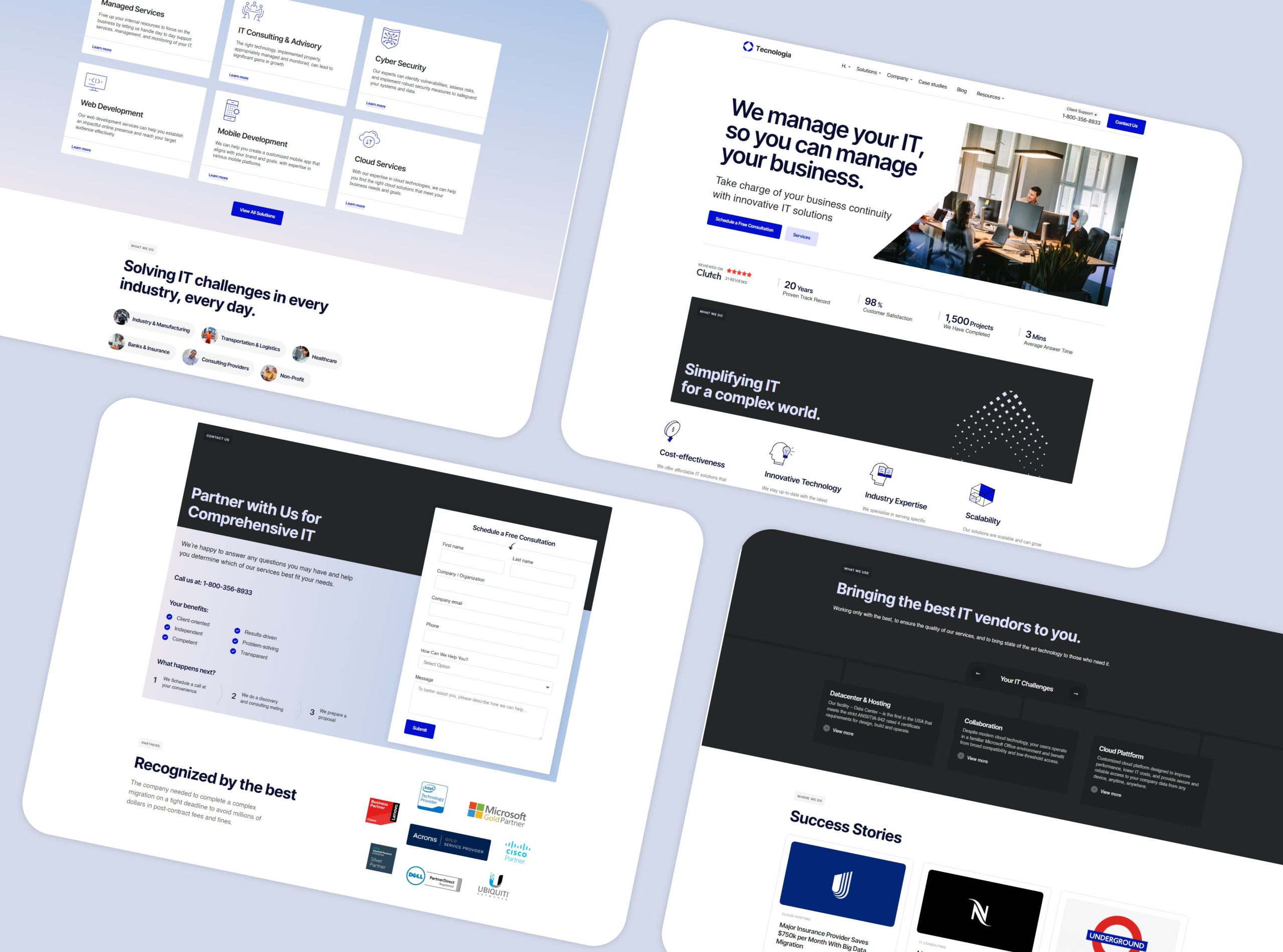 This project focuses on developing a WordPress landing page for Technologia, a SaaS service provider. Our goal was to redesign their website with a modern layout that feels confident, clean, and conversion driven. The final design helps users navigate their services without feeling overwhelmed by data heavy sections.