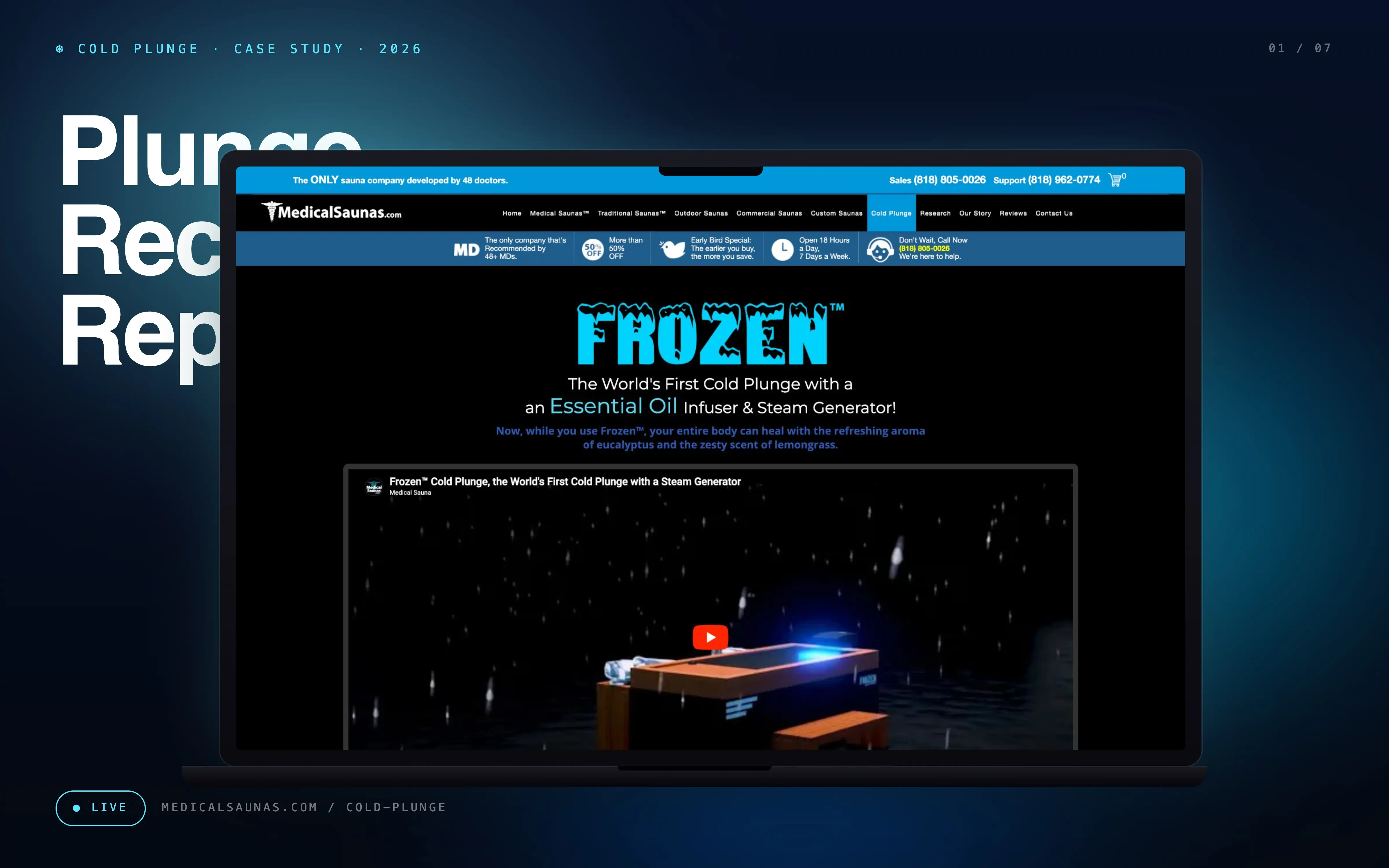 Frozen Cold Plunge is a wellness and ecommerce page concept for Medical Saunas’ cold plunge category. The goal was to present a technical wellness product in a way that felt trustworthy for clinics, recovery spaces, and commercial buyers while still being simple enough for everyday customers to understand.